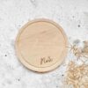 – Houten cirkel gegraveerd met ‘baby’ en een maand naar keuze.