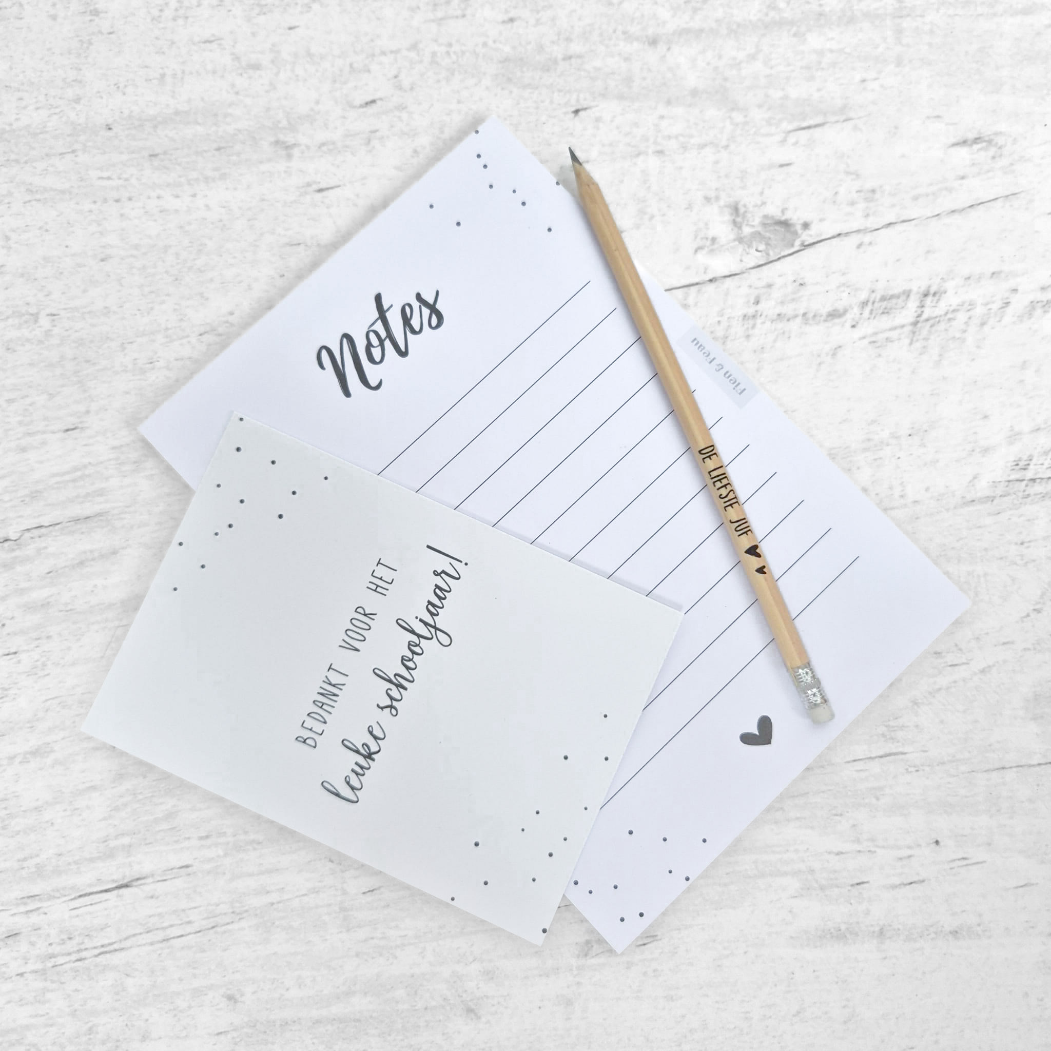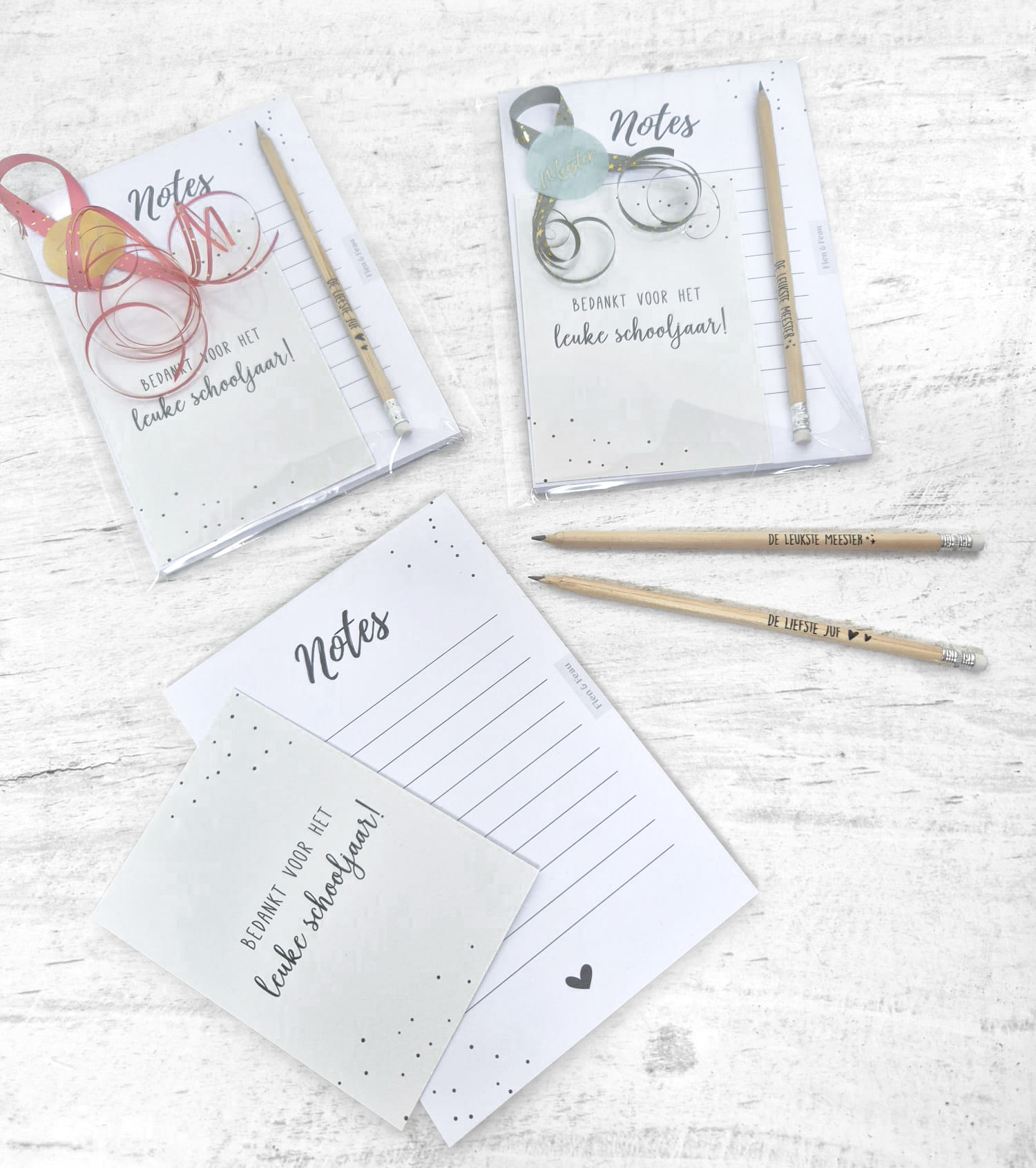 Dit cadeaupakketje is speciaal samengesteld om de juf te bedanken voor haar geweldige inzet van het afgelopen schooljaar. Dit pakketje bevat een notitieboekje (scheurblok), een potlood met opdruk ‘de liefste juf’ en een A6 kaartje met de tekst ‘bedankt voor het leuke schooljaar’! Het kaartje voegt een persoonlijk tintje toe aan het cadeau en laat de juf extra stralen!