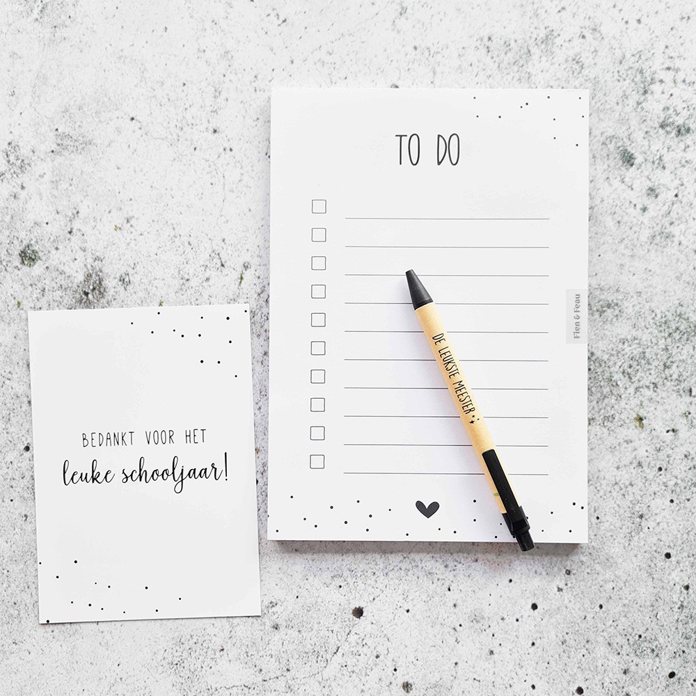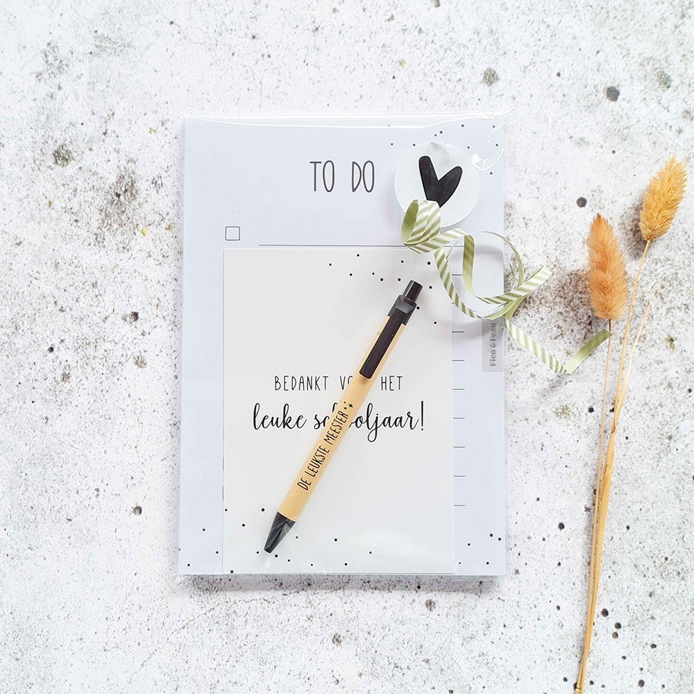 Dit cadeaupakketje is speciaal samengesteld om de meester te bedanken voor zijn geweldige inzet van het afgelopen schooljaar. Dit pakketje bevat een to do – scheurblok, een pen met opdruk ‘de leukste meester’ en een A6 kaartje met de tekst ‘bedankt voor het leuke schooljaar’! Het kaartje voegt een persoonlijk tintje toe aan het cadeau en laat de meester extra stralen!