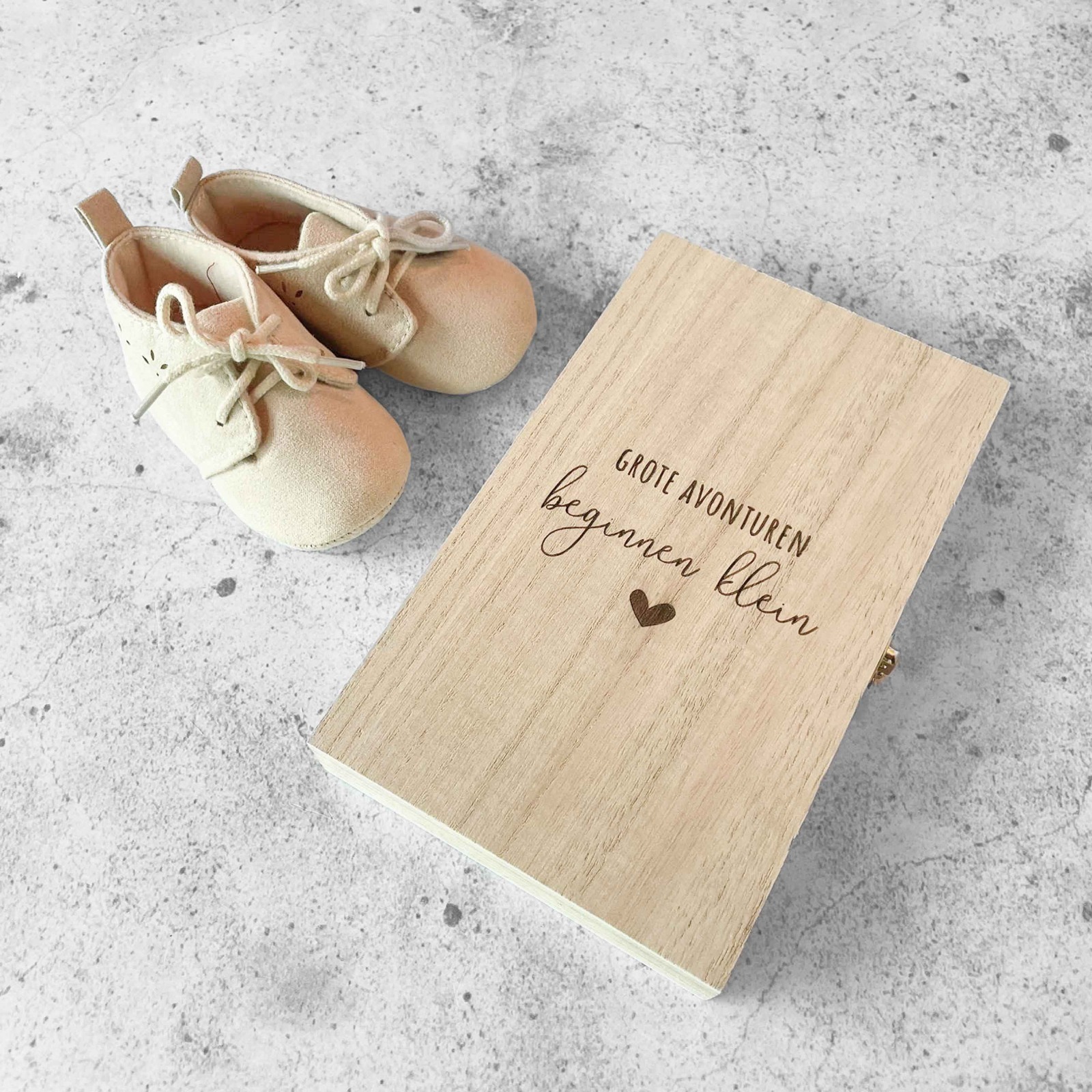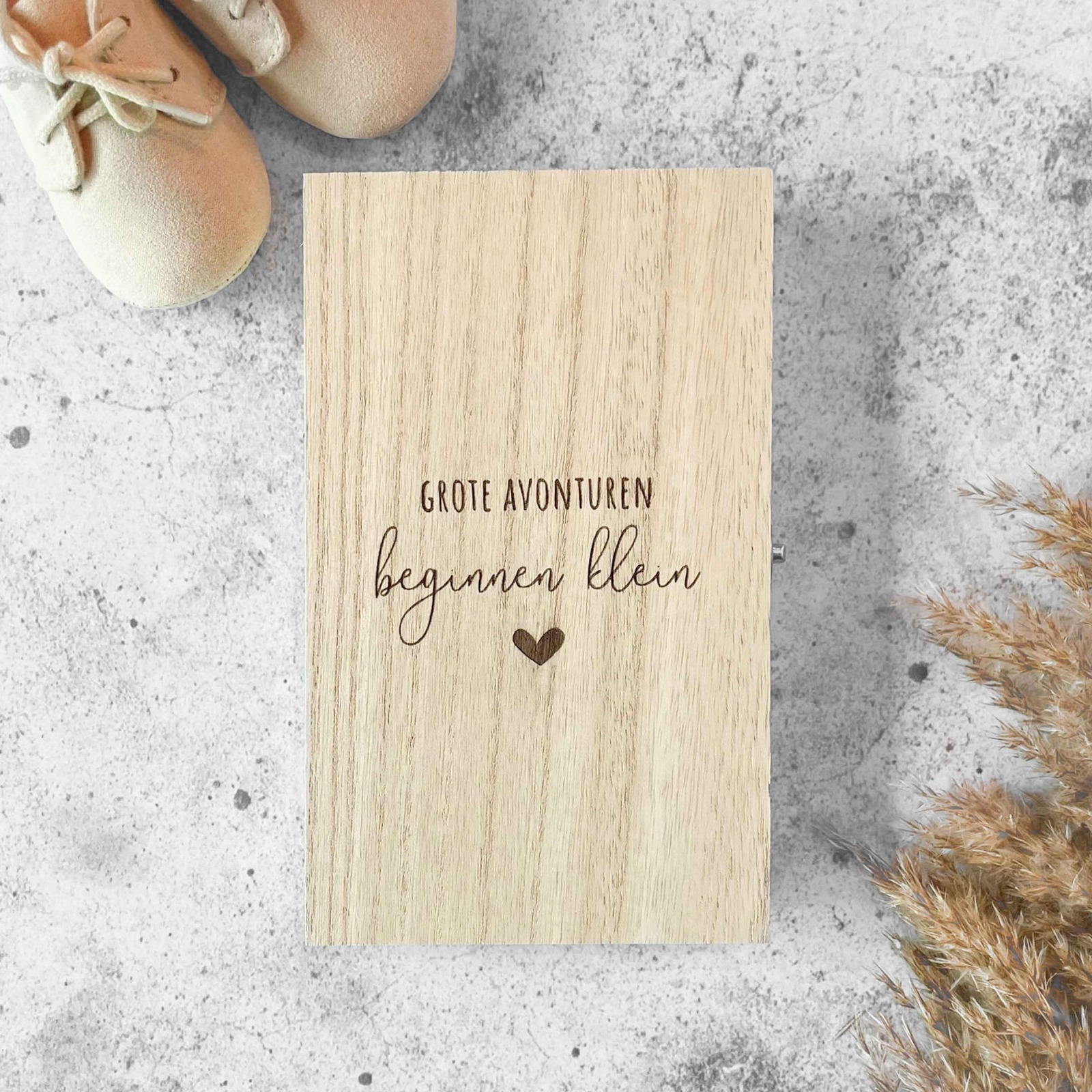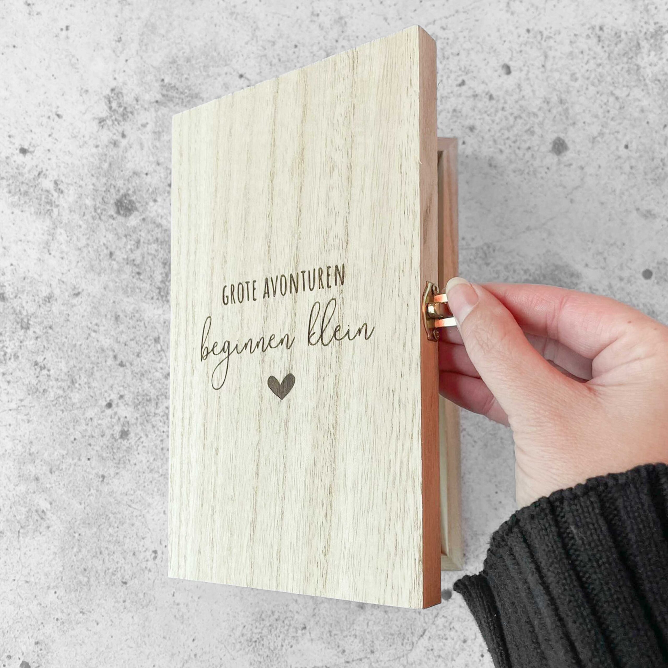 Dit bewaardoosje is ontzettend leuk om je zwangerschapsaankondiging bekend te maken, iets in te bewaren of om cadeau te doen! Het bewaardoosje is bijvoorbeeld perfect om een zwangerschapstest of echo in te doen. Of een klein (kraam)cadeautje! De opdruk is gegraveerd met de tekst ‘grote avonturen beginnen klein’. Wie ga jij blij maken binnenkort? Tip: wil je er iets in plakken? Gebruik dan dubbelzijdig tape!