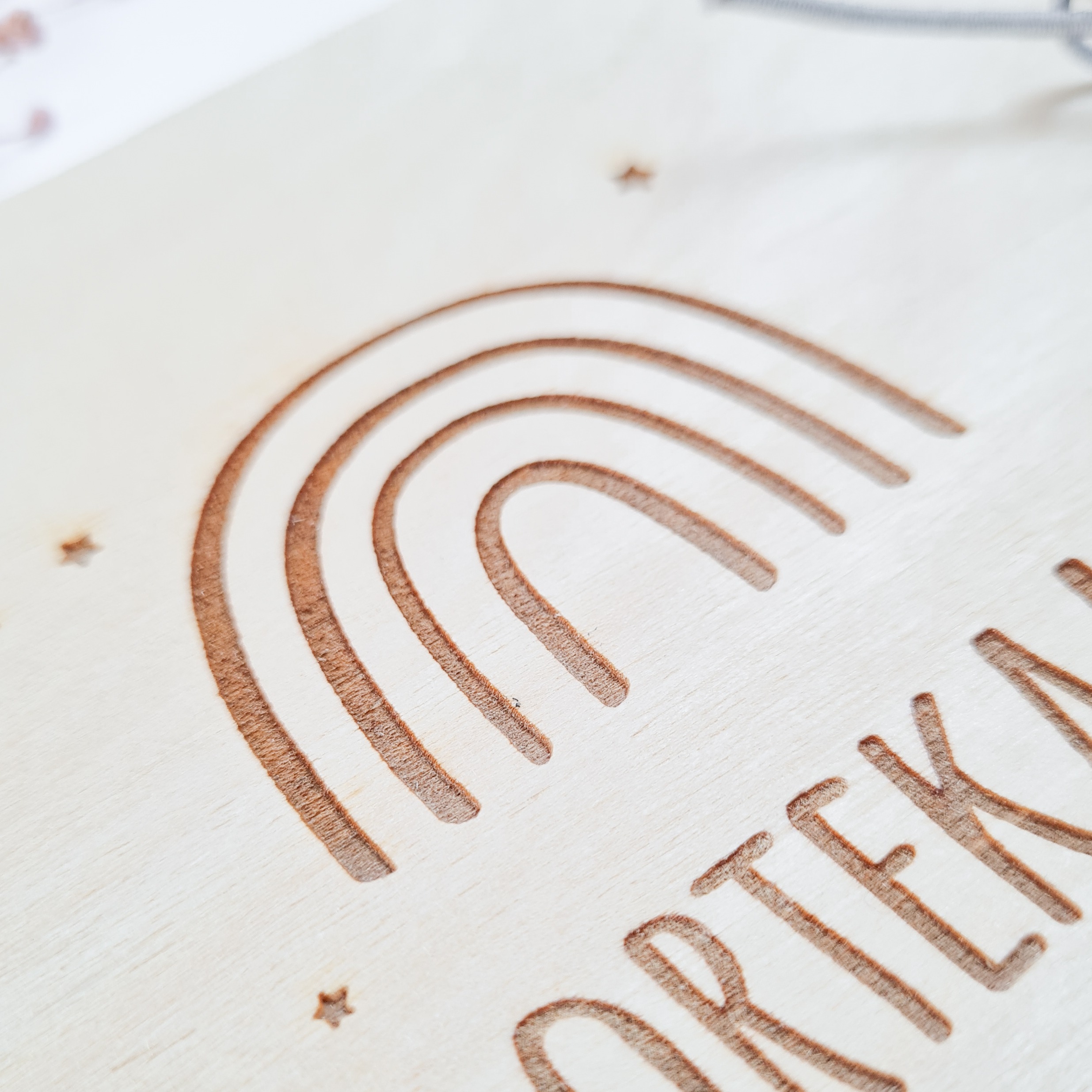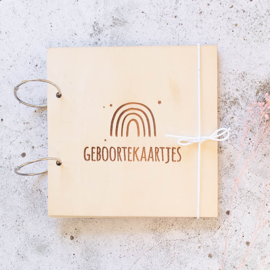 Houten bewaarbundel geboortekaartjes | 20 x 20 cm | Regenboog
