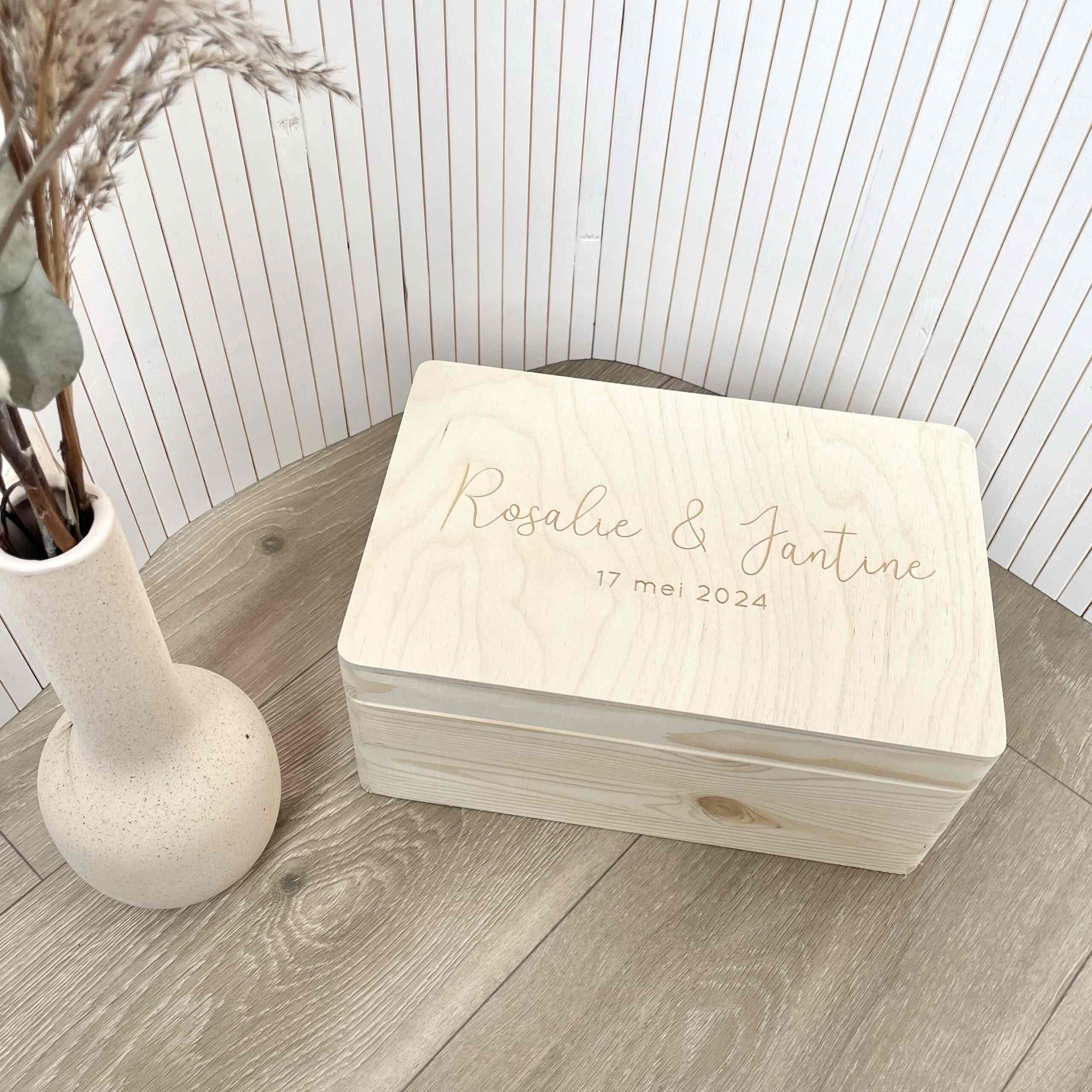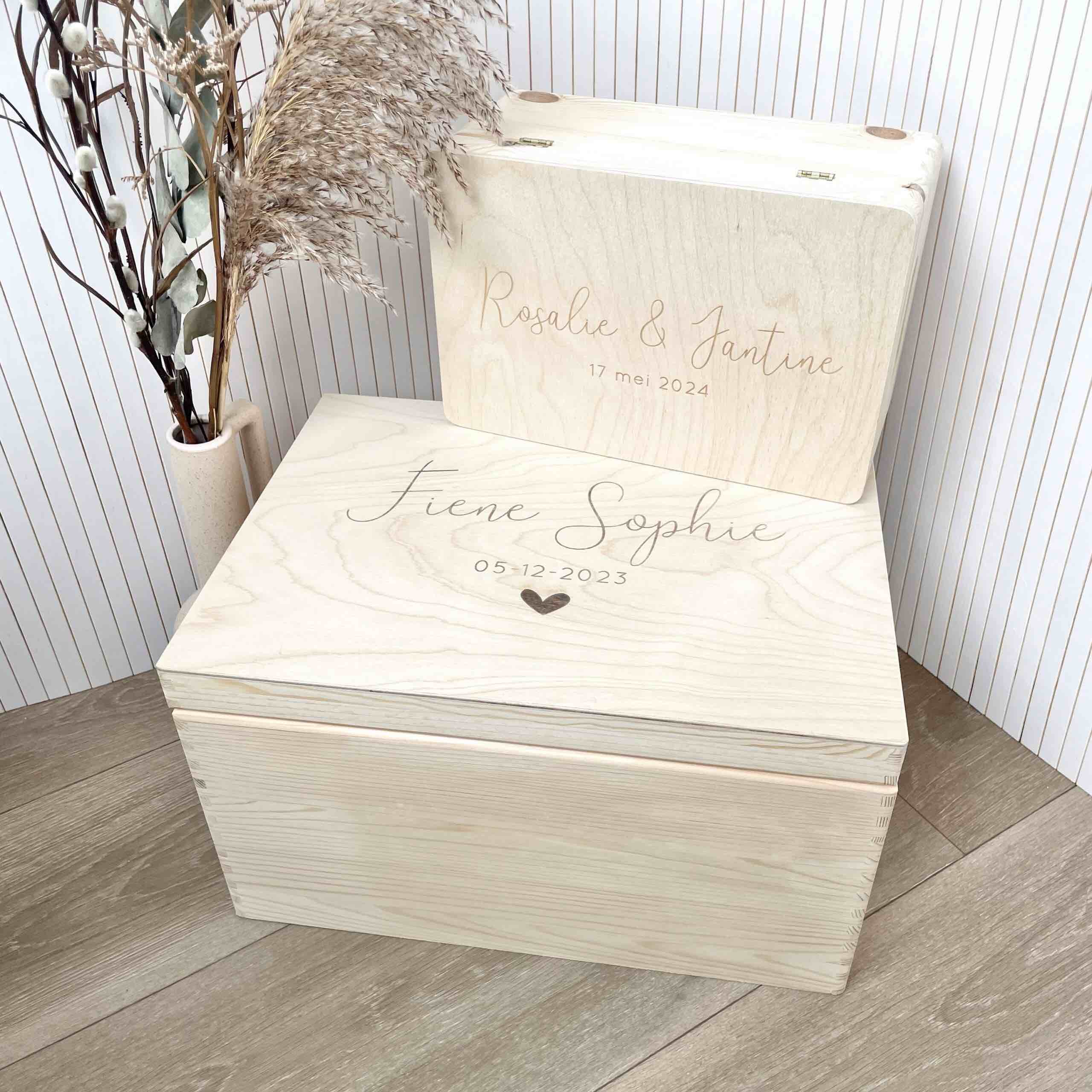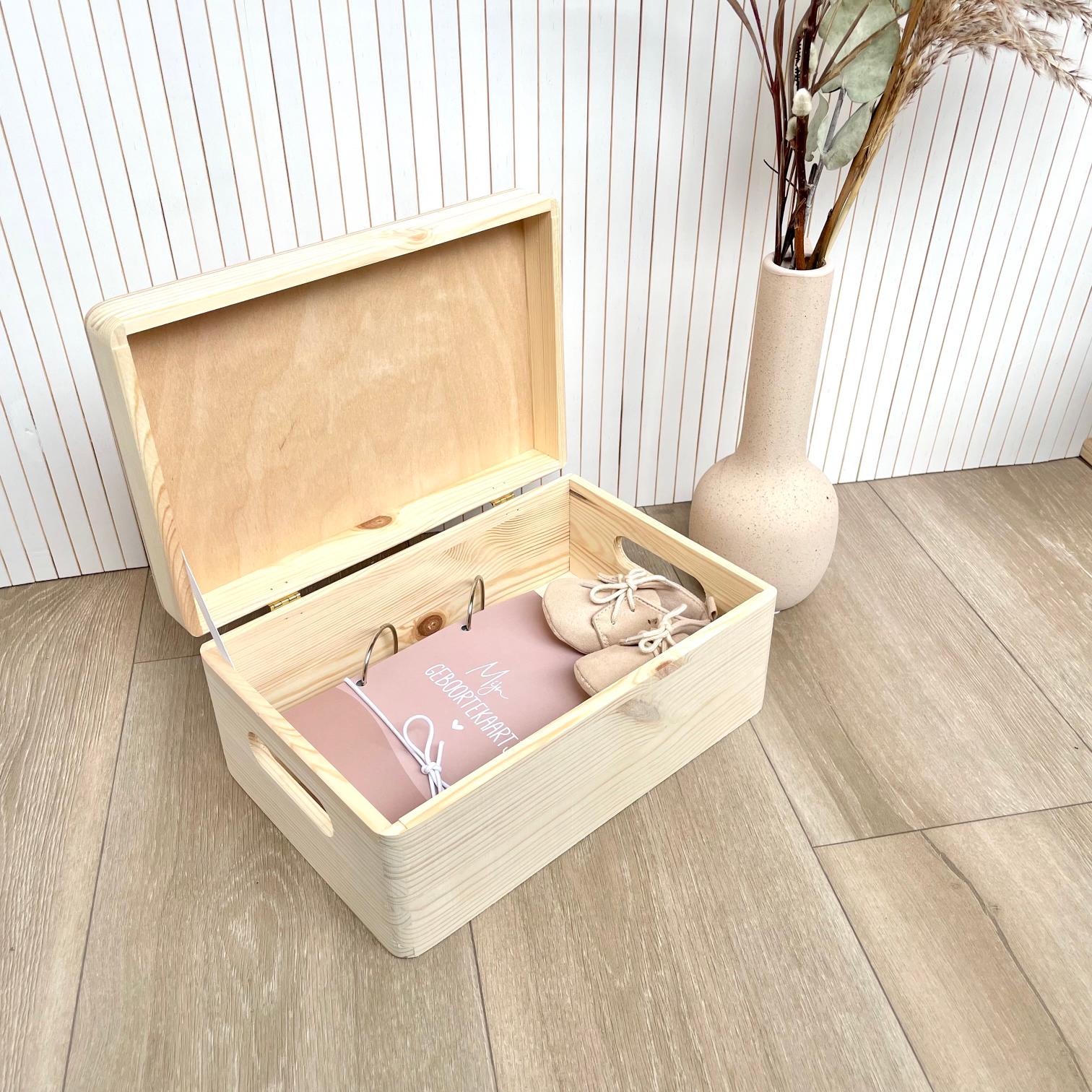 Een mooie plek voor al die fijne herinneringen aan jouw kind is deze houten bewaarkist. Deze kist kan gebruikt worden als geboortekist, maar ook als algemene herinneringskist waar je al je favoriete spulletjes van jouw kind in kunt bewaren. Liever een maatje kleiner? Die hebben we ook! Bekijk deze hier. Als je de bewaarkist wilt personaliseren kan dit! Op deze kist graveren we de opdruk.