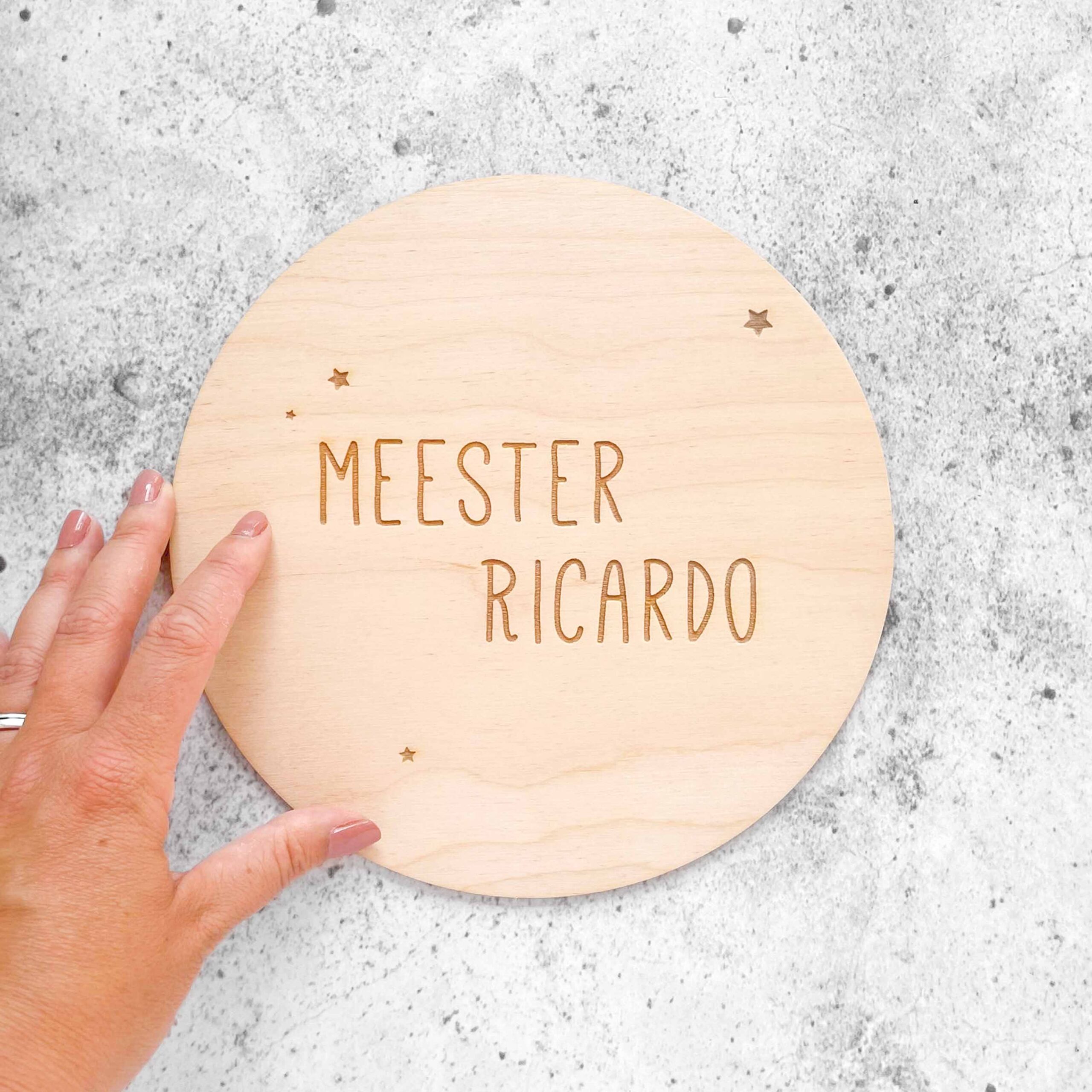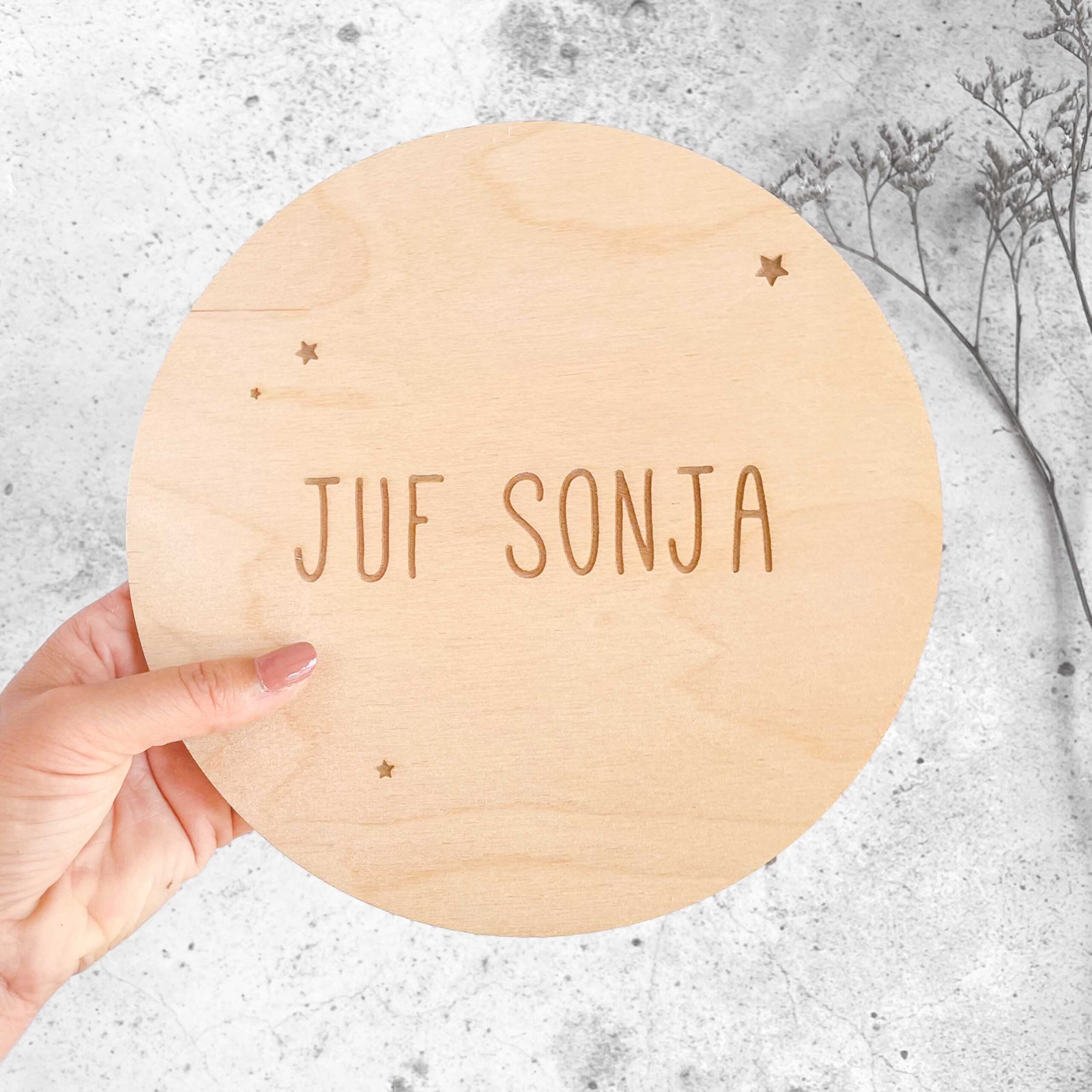 Zoek jij nog een cadeautje voor de juf, meester, je vader, zus of pasgeboren neefje of nichtje? Bestel dan nu deze gepersonaliseerde houten cirkel van 20cm! De opdruk wordt er op gegraveerd.