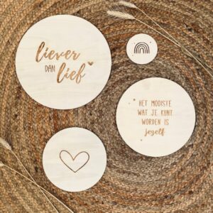 Houten muurcirkels zijn een mooie en unieke manier om je (baby)kamer te decoreren. We bieden ze aan in verschillende ontwerpen en verschillende formaten, zodat je ze leuk kunt mixen met elkaar. De cirkels zijn 3mm dik en de opdruk is gegraveerd. Ophangen kan met dubbelzijdige tape of een tandhanger, deze worden niet meegeleverd. Liever niet ophangen? Ze staan ook erg leuk in een kaartenhouder!