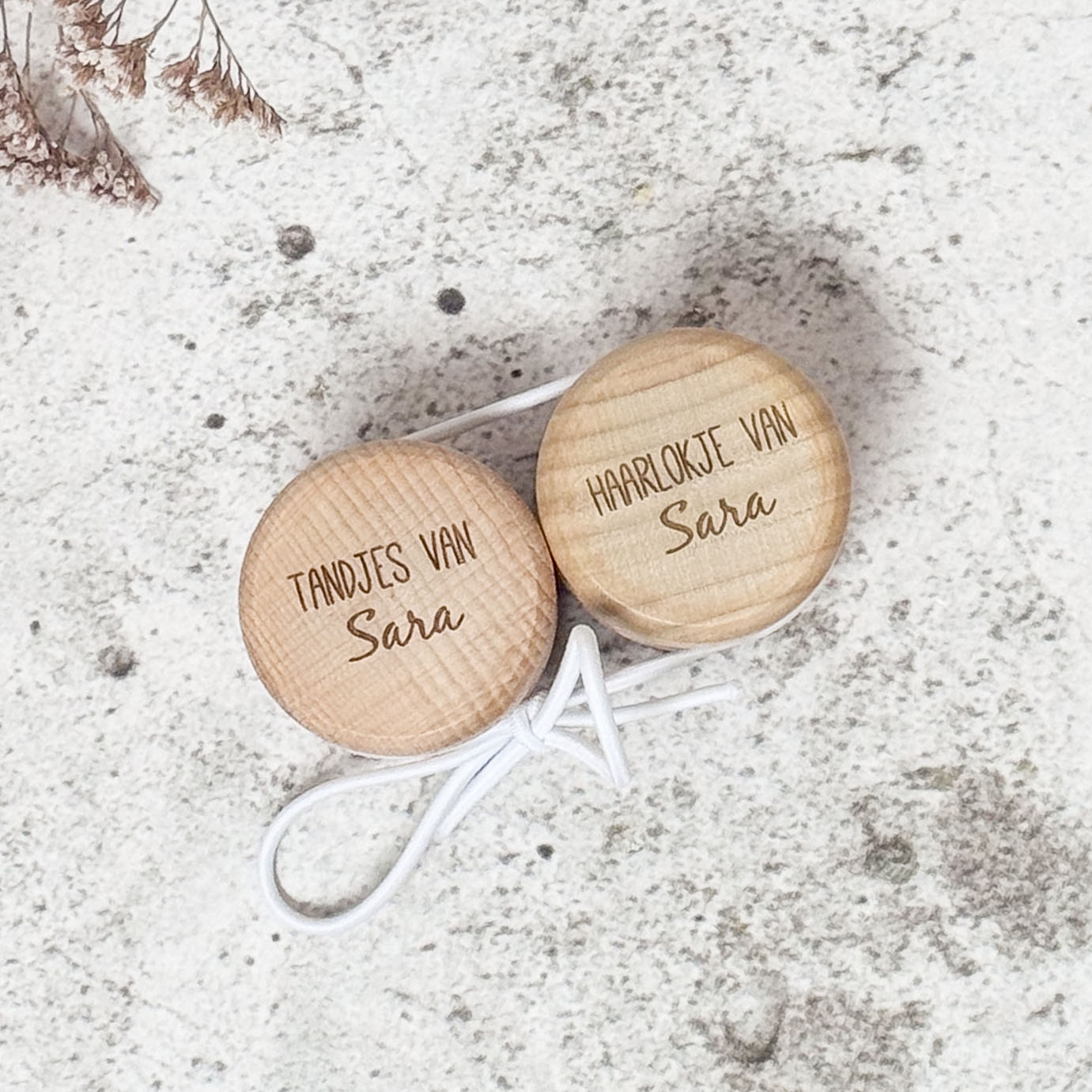 Bewaar de melktandjes en een haarlokje in één van onze tandendoosjes sets! Deze doosjes worden gepersonaliseerd met de naam van jouw kindje. Het doosje is gemaakt van beukenhout en is de perfecte manier om de kostbare melktandjes en een haarlokje van je kind veilig te bewaren. Het heeft een handige schroefdop en een compact formaat van 4 cm in diameter en een hoogte van 3,4 cm. Zo kun je het dus gemakkelijk opbergen.Specificaties: