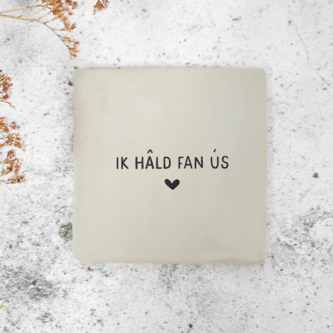 Keramieken tegeltje met de tekst “Ik hald fan ús, Tegehouder is los bij te bestellen. Leuk voor jezelf of om cadeau te doen!