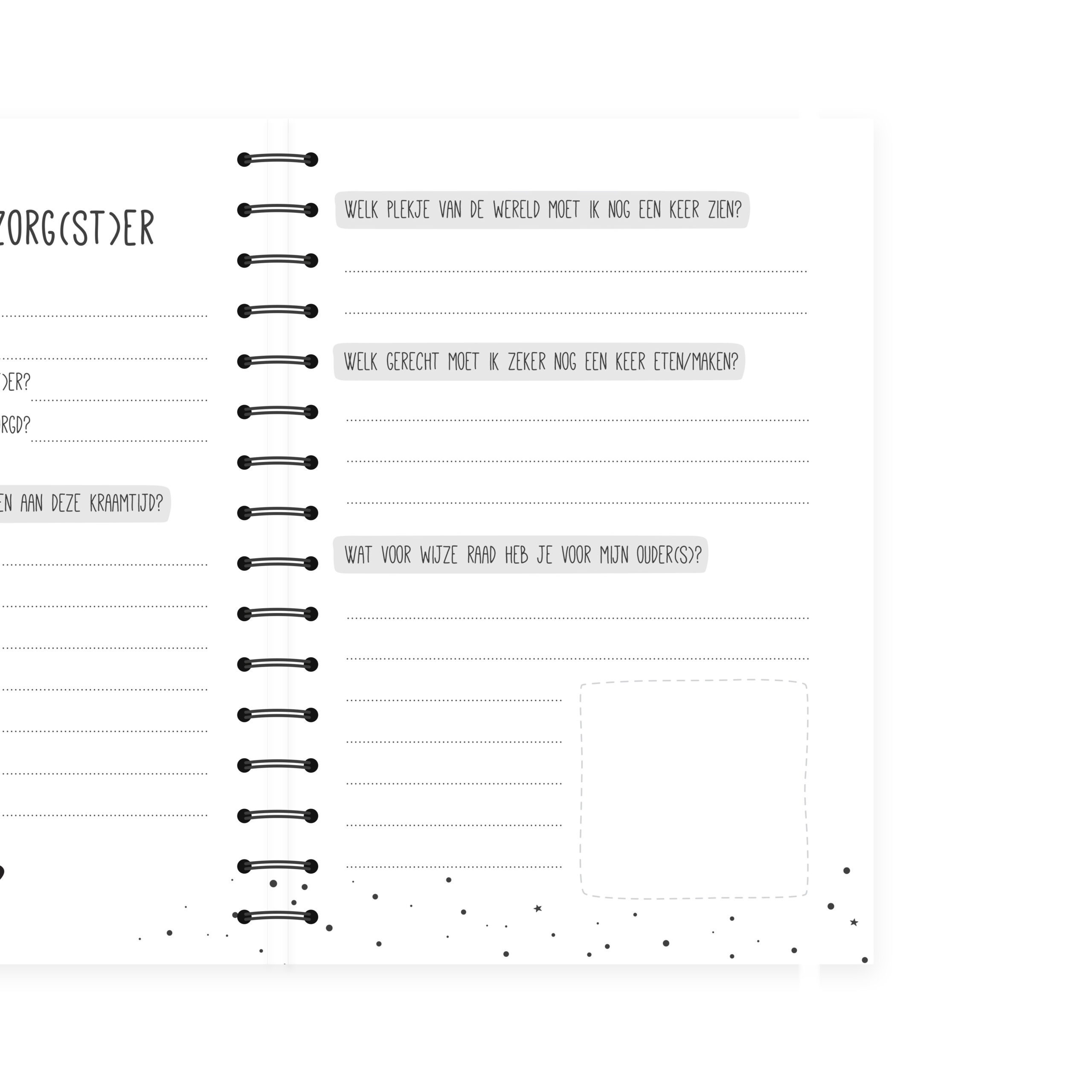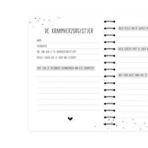 In dit kraambezoekboek is er ook een speciale invulpagina voor de kraamverzorg(st)er. Daarnaast is er op iedere invulpagina ruimte voor een foto van de kleine en het bezoek.