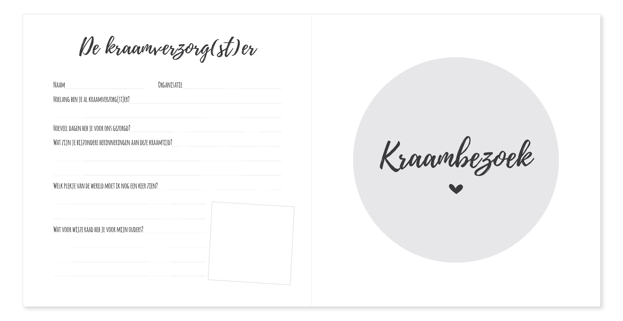 In dit kraambezoekboek is er ook een speciale invulpagina voor de kraamverzorgster. Daarnaast is er op iedere invulpagina ruimte voor een foto van de kleine en het bezoek.