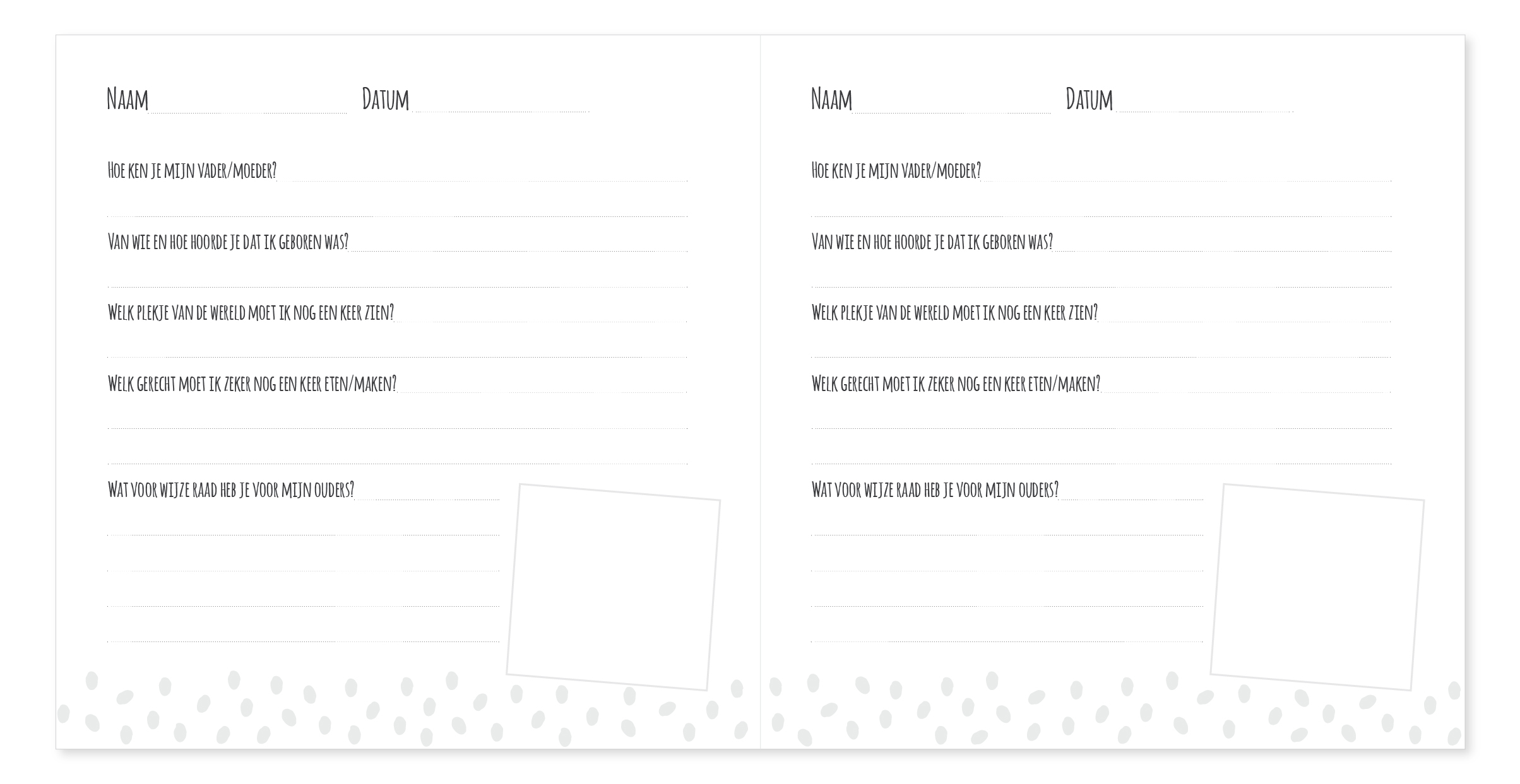 De kraamtijd is bijzonder. Vrienden en familie zijn ontzettend benieuwd naar de baby, en vaak kunnen ouders ook niet wachten om hun kindje zo snel mogelijk aan iedereen te laten zien. Laat de kraamvisite onderstaande vragen beantwoorden. Dit is ontzettend leuk voor later!
