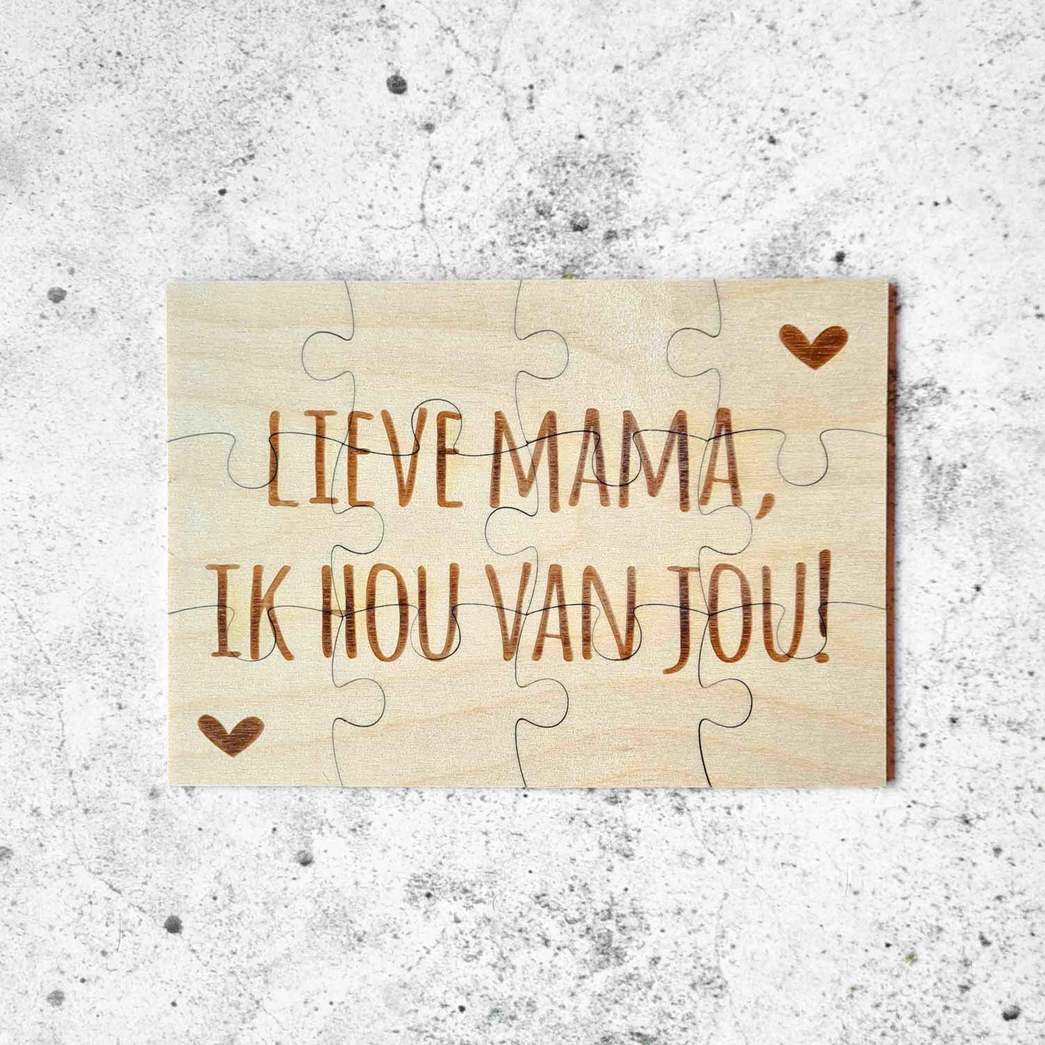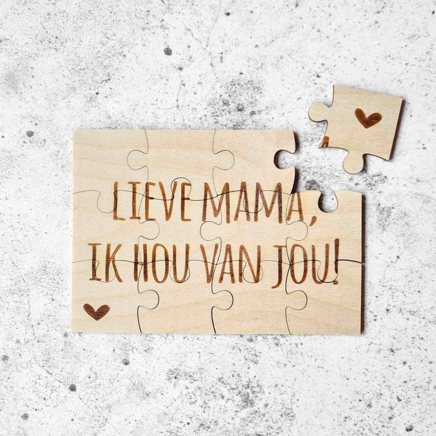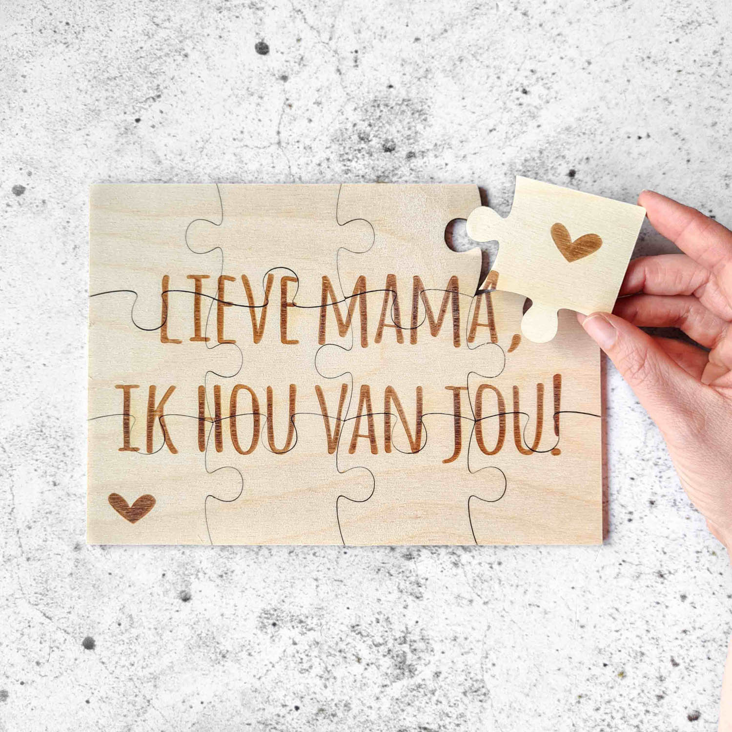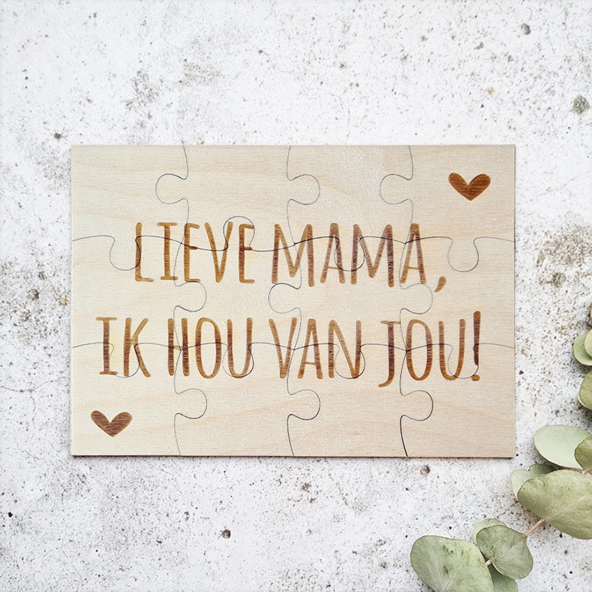 Is jouw mama de liefste? Laat weten hoeveel ze voor jou betekent door middel van deze puzzel! De puzzel heeft een formaat van een A5, bevat 12 puzzelstukjes en wordt geleverd in een luxe linnen zakje.