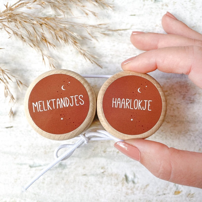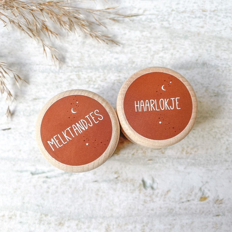 Wil je graag de melktandjes en het eerste haarlokje van je kindje bewaren? Met deze leuke set van twee houten bewaardoosjes kun je het op een leuke, handige manier koesteren! De doosjes zijn van hout en bedrukt met een sticker met de tekst ‘melktandjes’ en ‘haarlokje’.