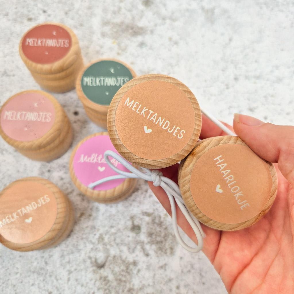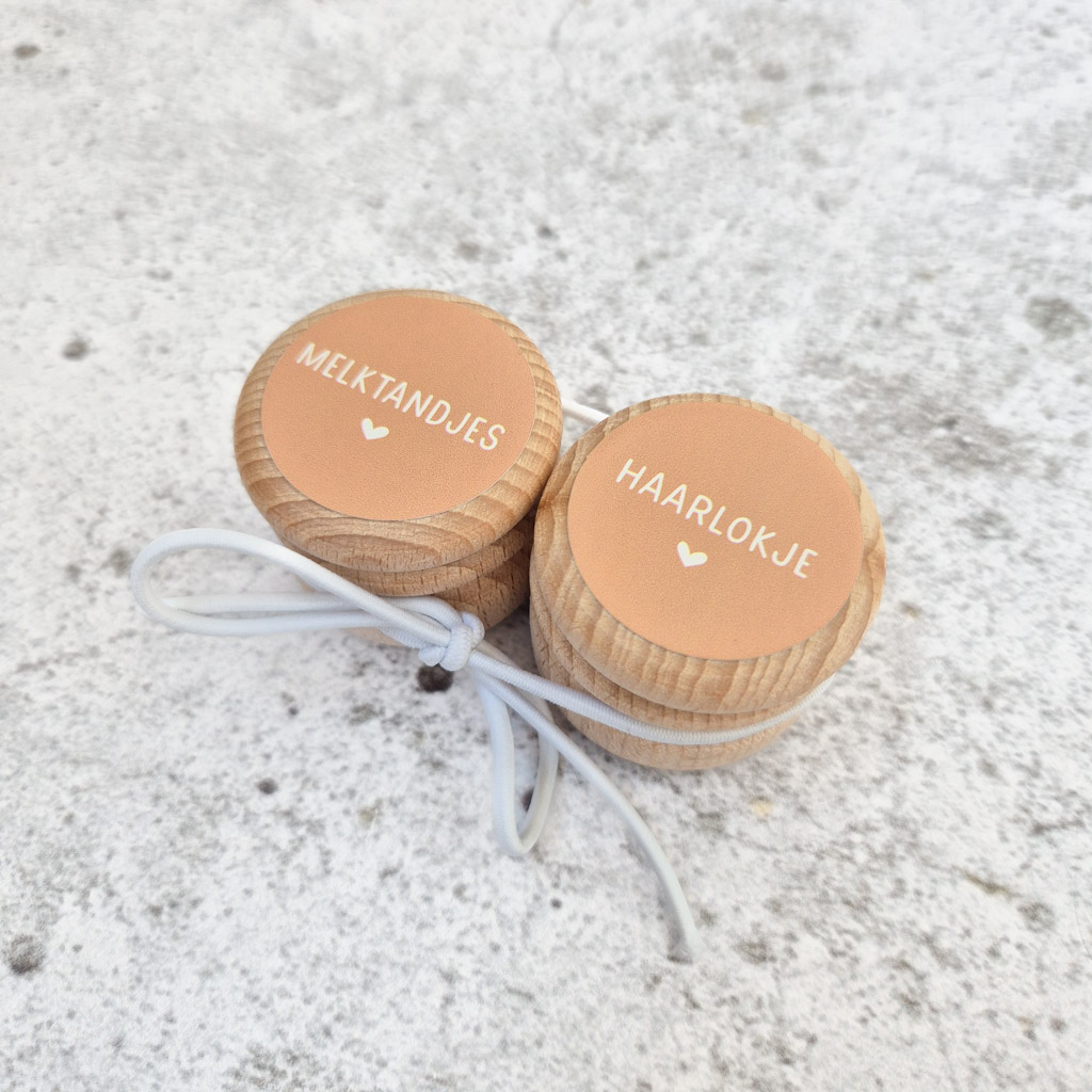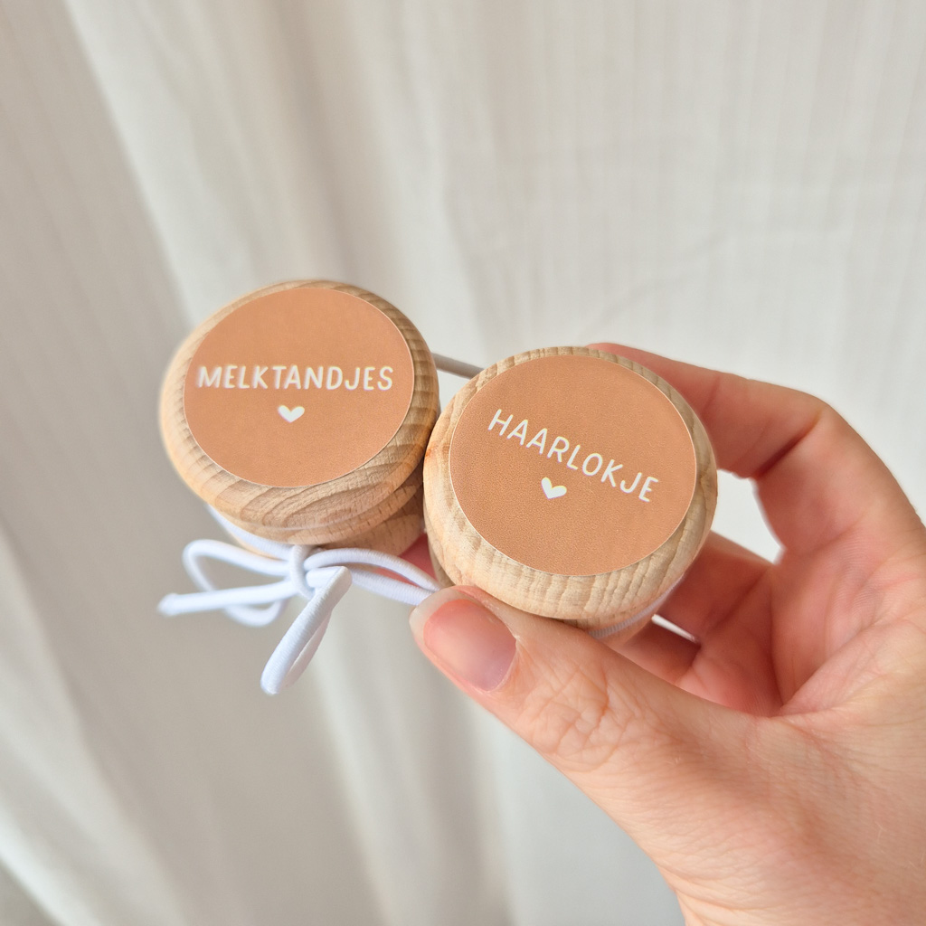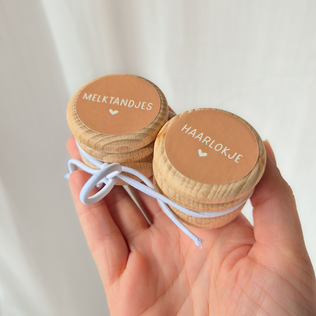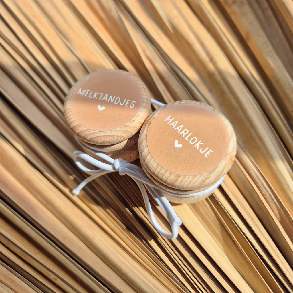Wil je graag de melktandjes en het eerste haarlokje van je kindje bewaren? Met deze leuke set van twee houten bewaardoosjes kun je het op een leuke, handige manier koesteren! De doosjes zijn van hout en bedrukt met een sticker met de tekst ‘melktandjes’ en ‘haarlokje’.