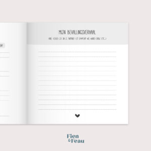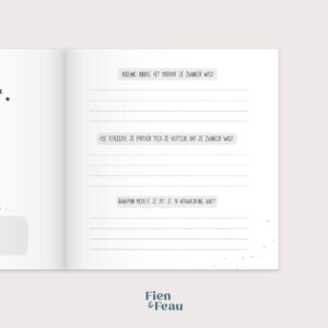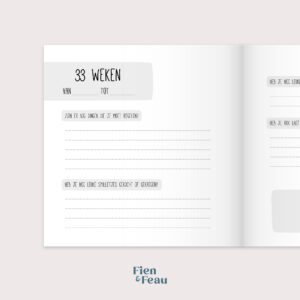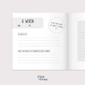 Naast de (bijna) wekelijkse invulpagina’s voor jou is er ook een invulpagina voor de partner, zijn er fotopagina’s om je mooie foto’s in kwijt te kunnen en kun je als je wilt ook je buikomtrek en gewicht bijhouden. Daarnaast is er ruimte om een brief voor je kleintje te schrijven voor later.