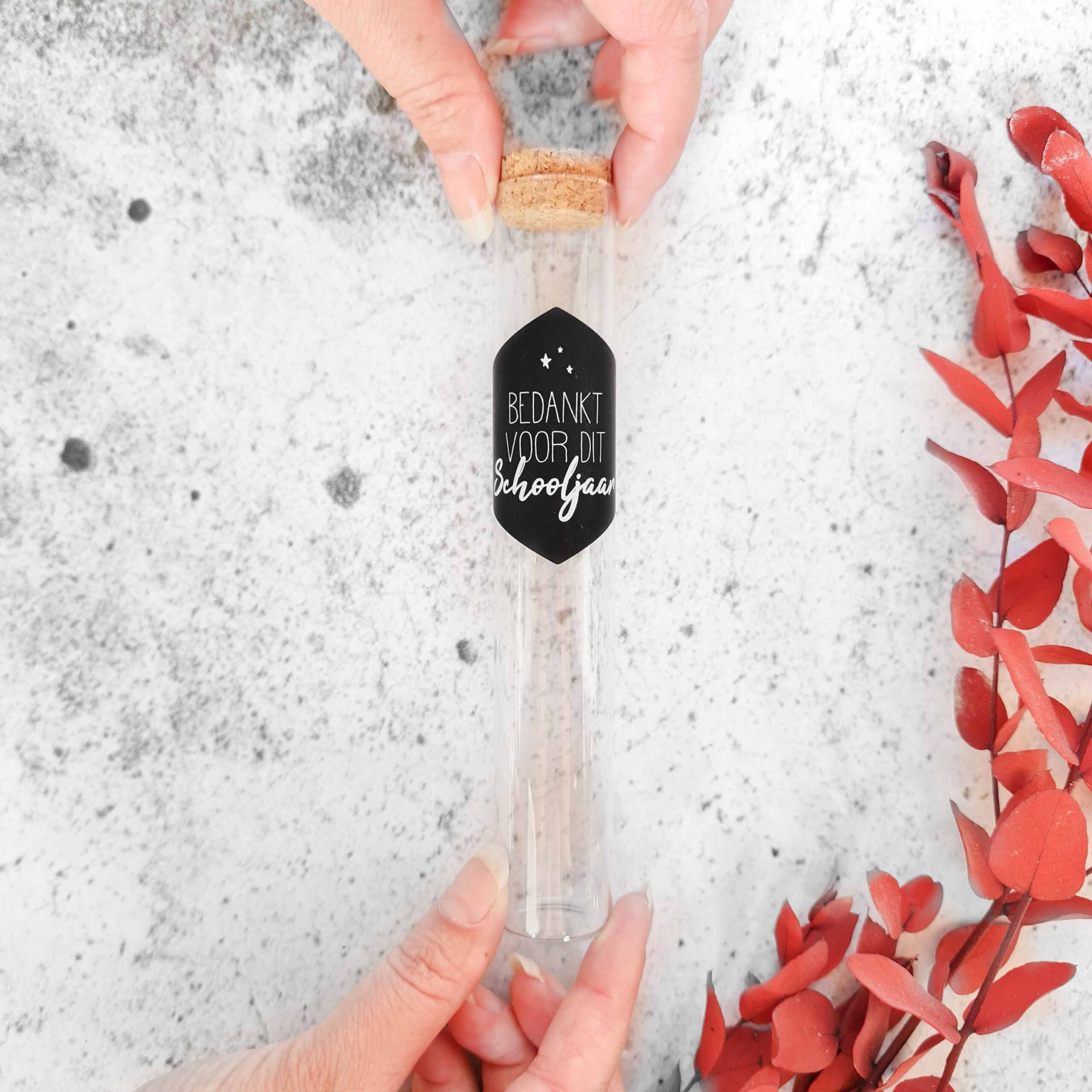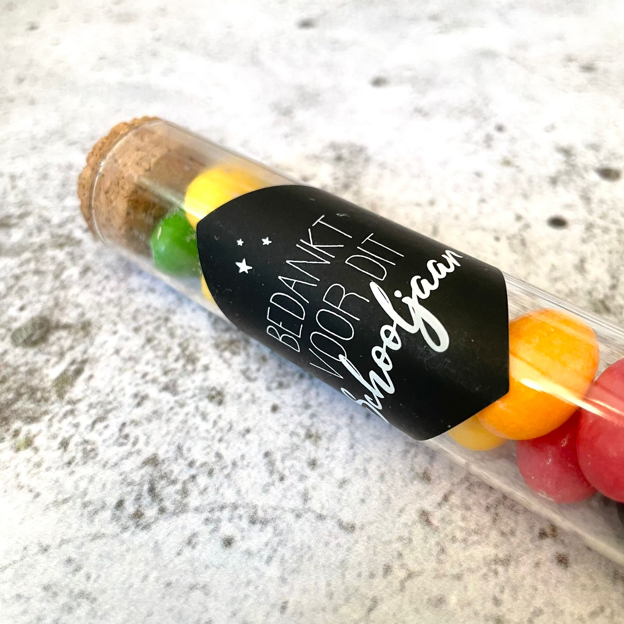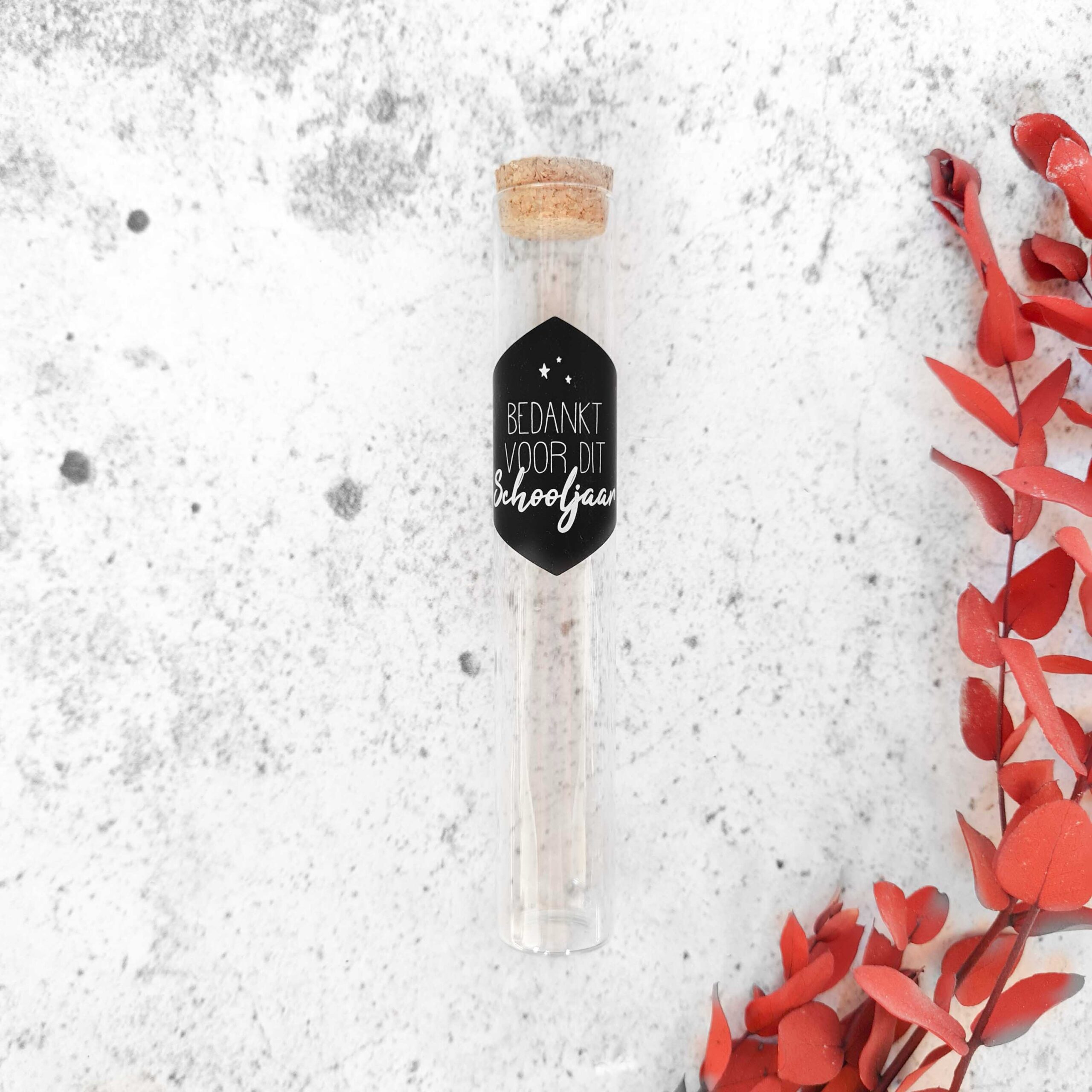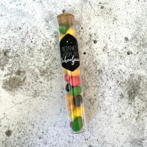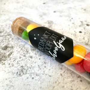 Bedank de lieve juf en/of meester voor dit mooie schooljaar met een klein presentje! Dit reageerbuisje kun je vullen met wat jij maar wilt! Misschien vind de juf of meester M&M’s wel heel erg lekker of heb je nog een ander creatief idee.