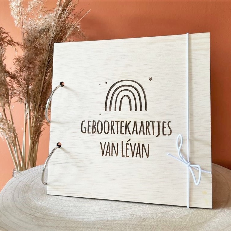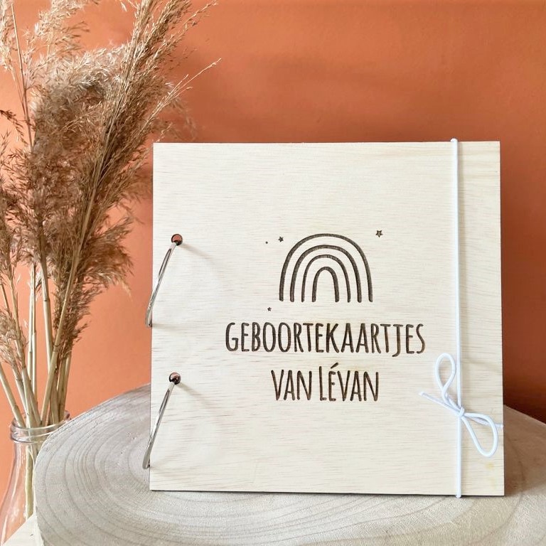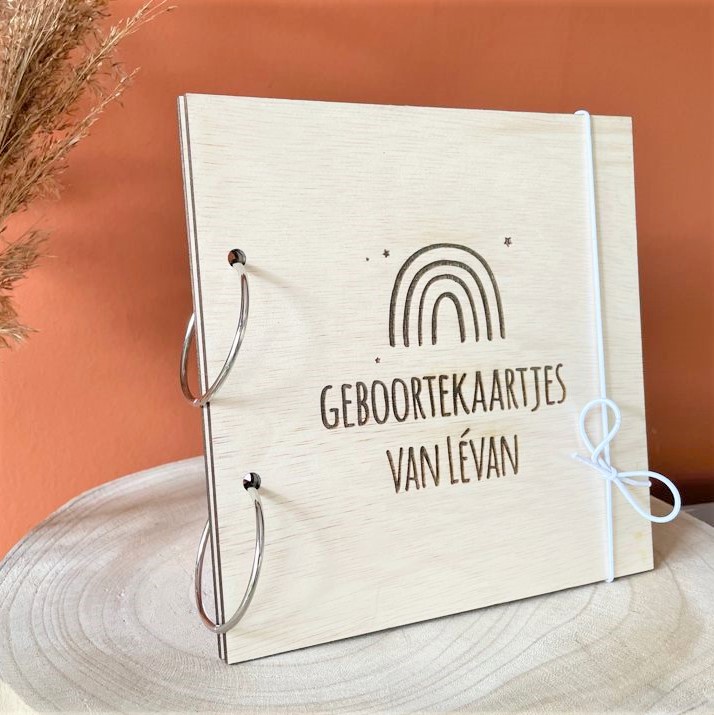 Bewaar alle bijzondere geboortekaartjes voor later in deze houten bewaarbundel! Door met een perforator gaatjes in de kaartjes te maken, kun je ze bundelen en als een boekwerkje altijd makkelijk bekijken. De houten bundels worden gegraveerd. Er passen ongeveer 30-40 kaartjes in. Afhankelijk van de grootte/dikte en eigen persoonlijke voorkeur.
