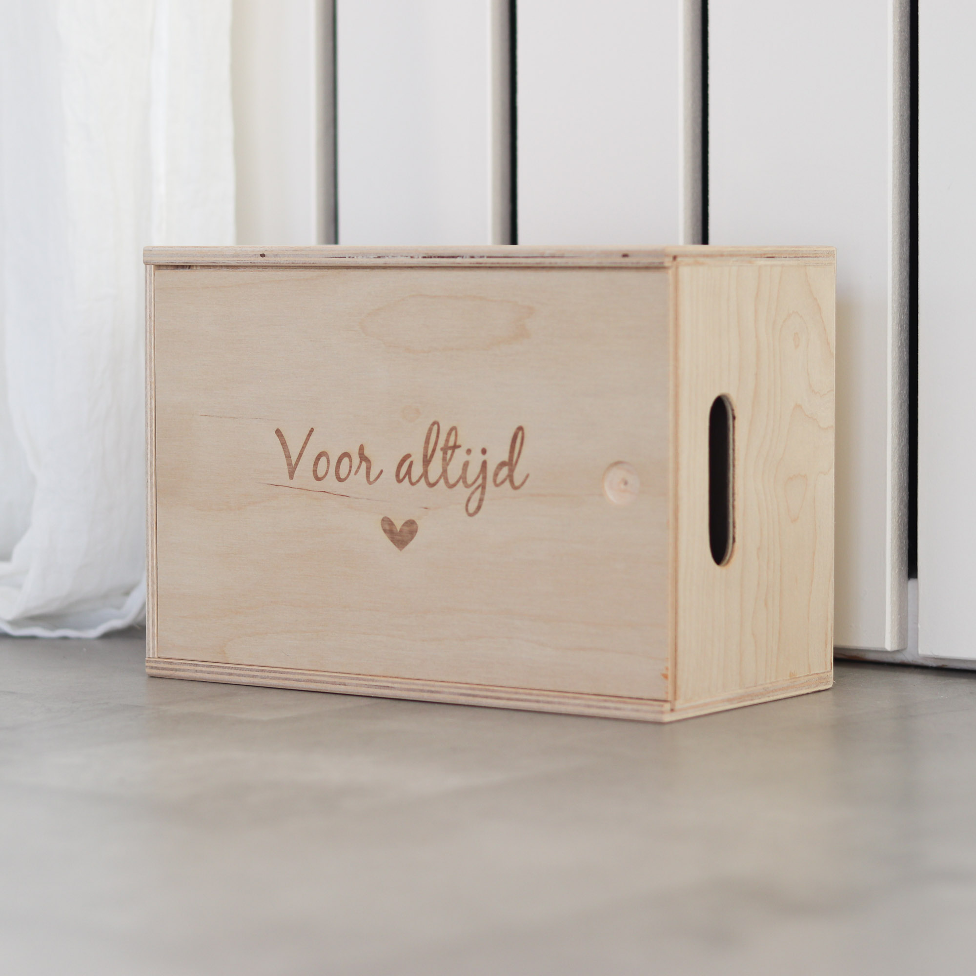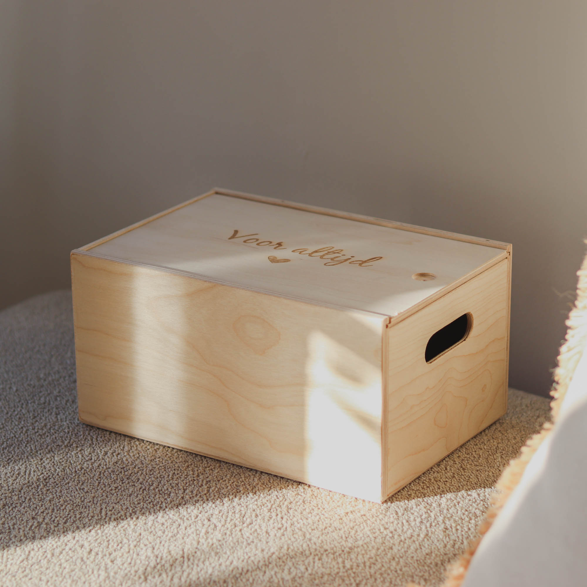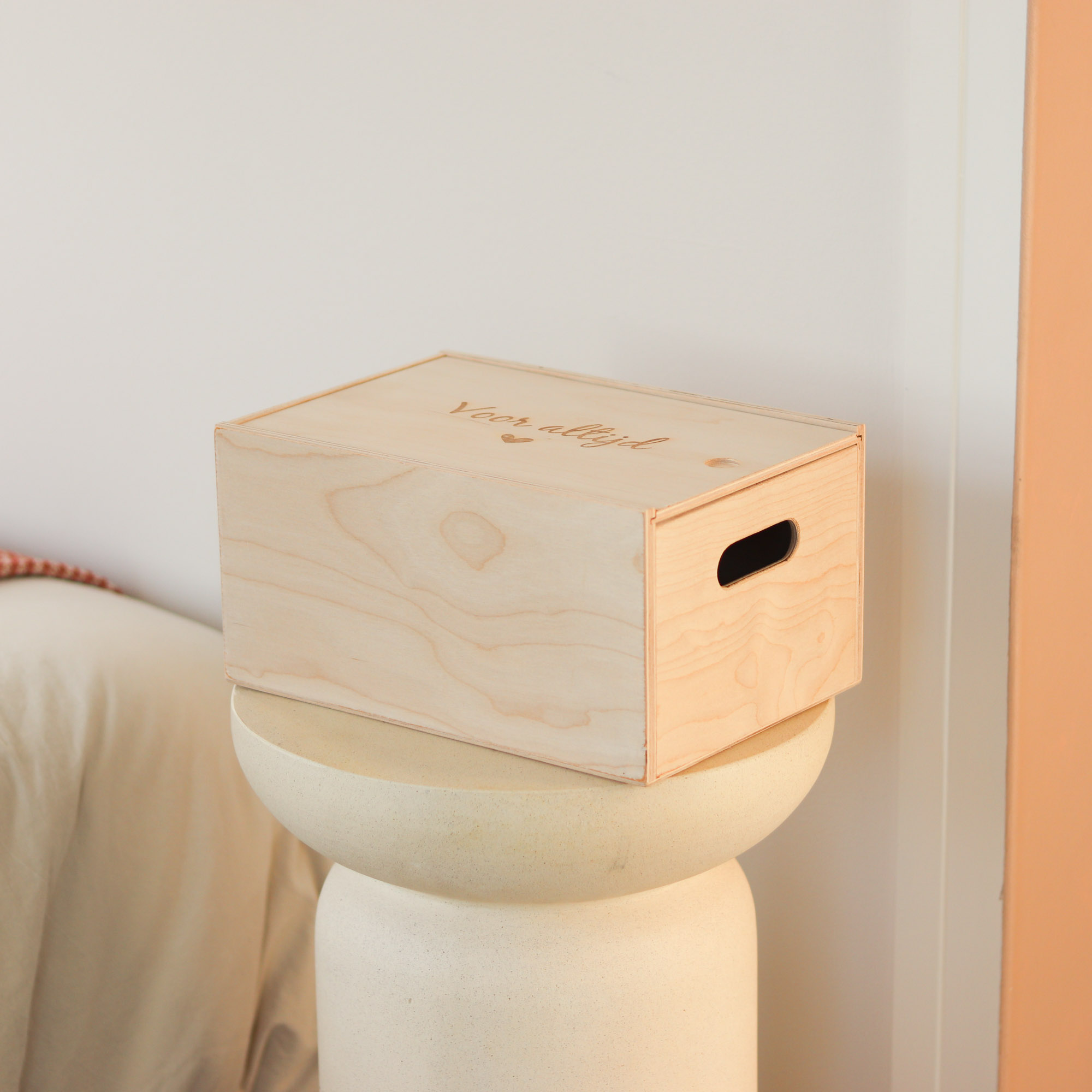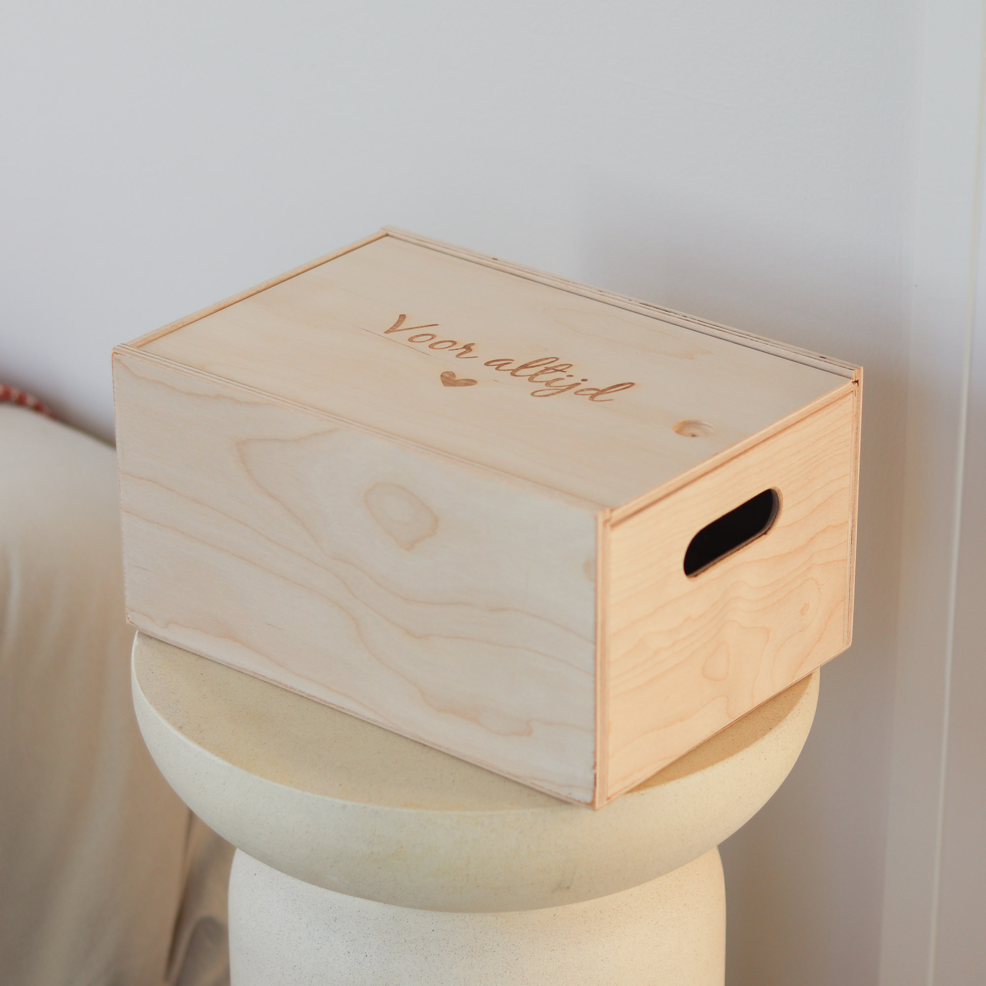 Bewaar en koester de bijzonderste herinneringen in deze houten gegraveerde bewaarkist. Het kistje heeft een formaat van L 30 CM x B 21 CM x H 15,3 CM. De schuifdeksel is gegraveerd voor een extra luxe uitstraling.