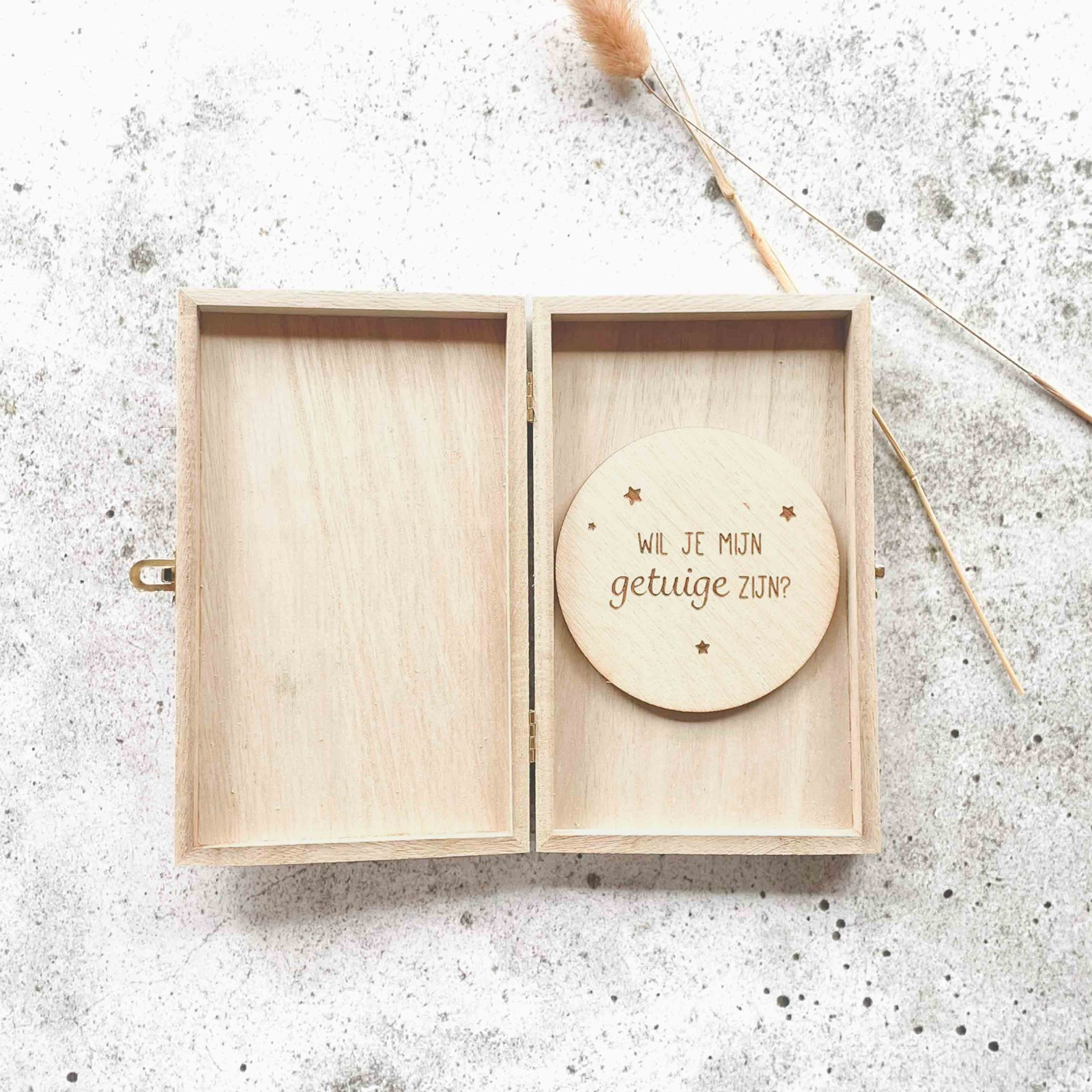 – Houten cirkel is gegraveerd met de tekst: ‘Wil je mijn getuige zijn?’