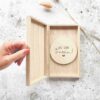Vraag je getuige op een unieke manier voor jullie bruiloft met dit mooie houten kistje! In het kistje zit een houten cirkel met daarop de tekst ‘Wil jij mijn getuige zijn?’. Deze opdruk is gegraveerd. Er is aan de linker binnenkant ruimte om nog een foto of kaartje te plaatsen. Zo wordt deze bijzondere vraag nog specialer!